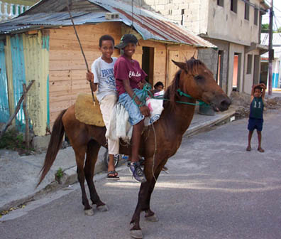 Half an hour out of Luperon, we are in palm tree studded mountains surrounded by rural farms and ranches. Motor scooters have given way to Burros and Horses as the preferred method of transportation and a sampling of the produce is for sale at small tables and lean-toos along the road (there is only one road that goes through this part of the country). We stop at one for a breakfast of Cafe, Fried Eggplant, Broiled Plantains, Charcoal Broiled Chicken, and the best Sausage (Chorizo) I have ever had. It is spiced, hand cut chunks of port stuffed into a sausage membrane. Muy bien!
