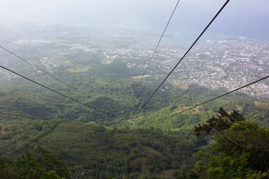 We are in Puerto Plata because we heard about a Cable Car that takes you high into the mountains. It is the same one that was used in Jurassic Park. .......................I can tell from the deathgrip that Barb has on the Gondola's railing that she is enjoying the ride up. As the top approaches we slip into the bottom of a cloud and spend the last 100 yards eerily floating vertically along a cliff face.