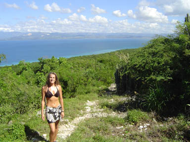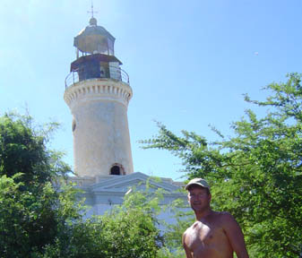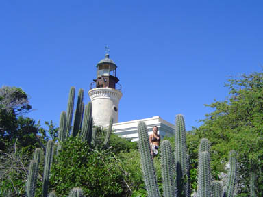 The view from the light toward the coast of mainland Puerto Rico is spectacular. Keith poses me in the middle of it.