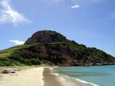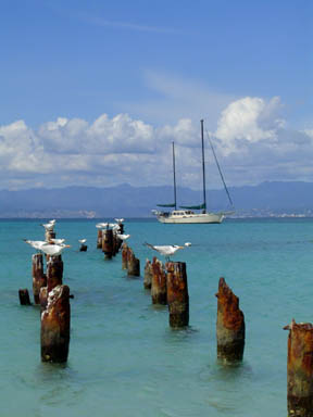 We arrived yesterday & instantly headed for the island. Actually, Keith couldn't wait to dive into the crystal blue water. He swam almost all the way to shore from our anchorage about 200 yards off the southeast cliff. About halfway to the beach, he remembered my broken ribs and that I can't swim one-armed and can't get the engine from the mount down to the dinghy, so I'd be trapped on the boat while he explored the island. It took him another 50 yards to turn back, but he did. It was somewhat touching, as I could see the whole mental -- and physical -- struggle quite clearly from the boat.