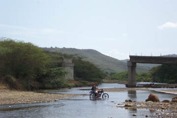 Smiling locals who direct us at every fork in the (so-called) road! I tell Keith about growing up on Cape Cod, the ever-present war against the tourists who kept our economy alive. My friends used to give tourists the wrong directions just because they were tourists. When a woman directs us down a road that dead-ends in a streaming river, he says, "Maybe she was from Falmouth." But she was right. Turns out you just need to keep right on going -- through the river. The giant bridge (currently about 30 feet above the low, low water level) washed out in the last rainy season. If that's how high the water gets, come this rainy season, no one will be making this journey along this route.