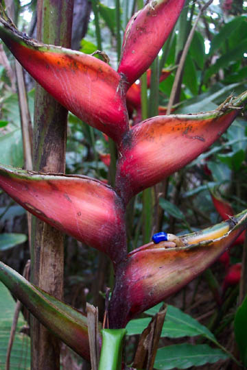 The continual misting by passing clouds has turned the top of the mountain into a natural greenhouse for a profuse variety of exotic flowers. Here is one in particular that caught our interest.