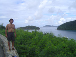 Isaac was up early and ready to explore the island.......by taxi. "This is not New York City my friend", I muttered as we studied a chart of the island. Being a game soul, he allowed me to convince him that with a full day ahead of us, we could easily hike the six miles to Cruz Bay, the only village on the island. So we dingied into Mahoe Beach, secured the dingy and started off. Of course, this was one of those days where a squall line ran up the island chain. We where quickly drenched only 15 minutes into our journey. Rain...then sun...rain...then sun....steadily for our next 4 hours of walking. Since there are only two directions on St John, up and down, we started looking forward to the cooling downpours. At the top of each hill, the view was spectacular. Isaac commented on how clean the island was. Although we where walking along a main road, there was absolutely no litter to be found. We took that as a challenge and after 2 hours, Isaac spotted a bubble gum wrapper among the leaves. We explored the ruins of several Sugar Cane Refineries, what used to be the islands main economic base. Never did figure out where they grew it though. I guess the rain forest quickly reclaims what is not consistently cultivated.